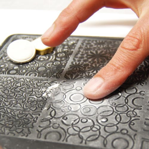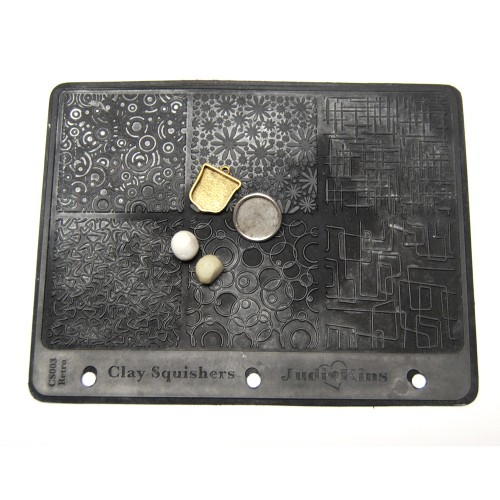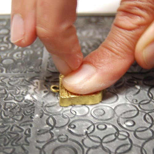 Now, let’s make an impression in our epoxy clay. Sprinkle or rub a wee bit of the baby powder over the surface of your Clay Squisher or texturing source. The baby powder will help the clay not stick to your surface. Place your Epoxy Clay-Crystal Clay filled finding over the texturizing pad and squish down with equal force. I like to pick up the mold and use my fingers to push from the top as well as the bottom to create a good impression.