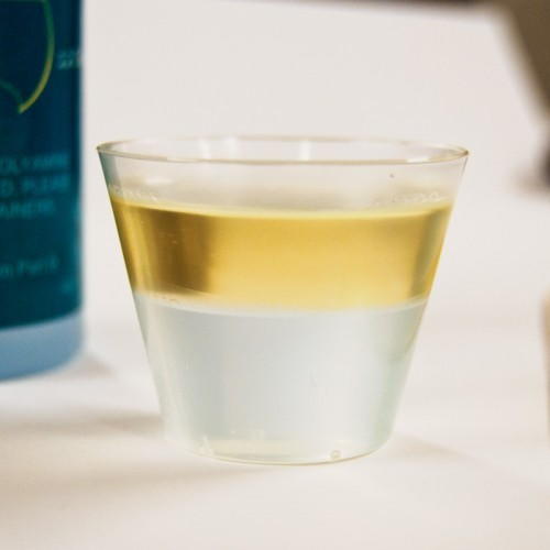 Mixing your resin: Place one cup (included in the Nunn Design Resin Kit) onto your table. For curing purposes, it is very important that the resin be an exact 1 to 1 ratio of Part A and Part B. I suggest getting your eyes level with the resin so you can see the lines on the measuring cup. Pour Part A of your resin kit up to the ½ fluid ounce mark on your measuring cup. Pour Part B of your resin kit into the same cup until it is filled to the 1 fluid ounce mark. It is important to pour Part A first and then Part B. It is some chemical thing about the part B being heavier or something.