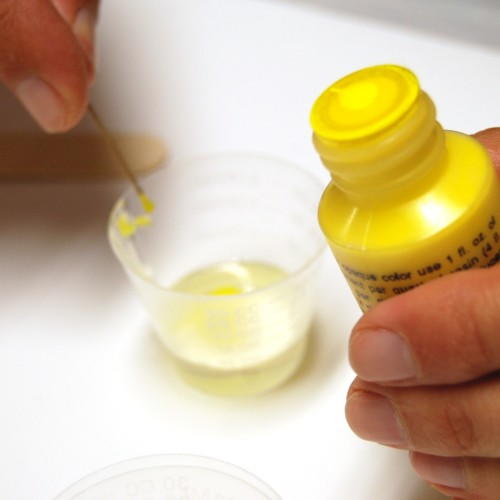 After your resin has been under the lamp for 5 minutes, pour a small amount of the mixed resin into a measuring cup. Add in a couple drops of the Castin’ Craft Opaque Pigment to give the resin color. I like to use a toothpick or a headpin to add the pigment to the resin. You only need a tiny bit to color the batch. If the resin isn’t as opaque as you would like, add in a drop of the White Opaque Pigment. You can mix the full 1 fluid ounce of resin if you want, but I transfer the resin into smaller cups because it is easier to stir and less messy to move around when less full. To make this tangerine color, I mixed a headpin of yellow and red pigment.
