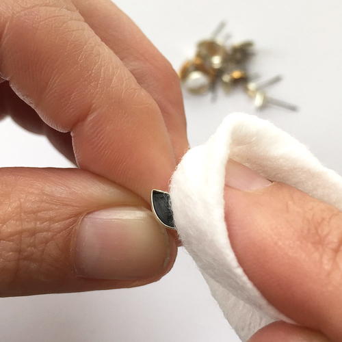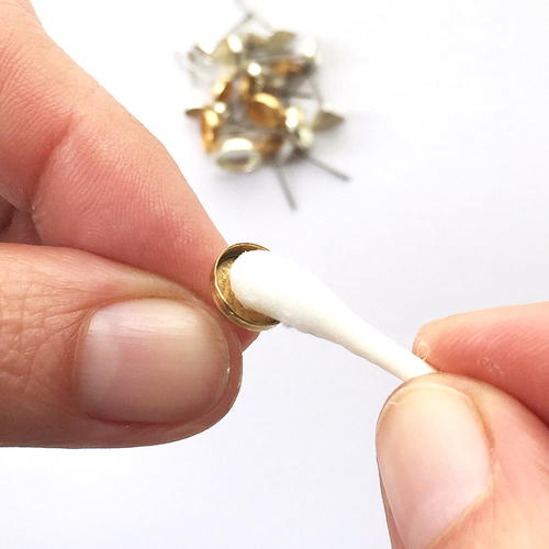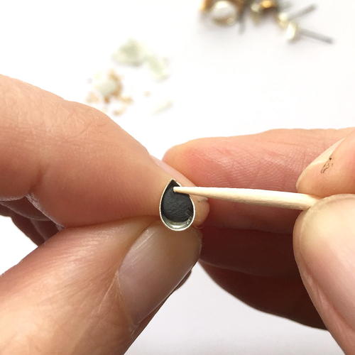 The Nunn Design Bezels are oxidized to provide the antique look to the precious metal plating. The oxidization, when it comes into contact with resin could change the color of the resin. To avoid this, clean the bezel thoroughly prior to applying the resin. Get the tip of a Q-Tip wet with rubbing alcohol and clean away any of the blackened oxidization, especially from the inside of the bezel.