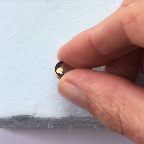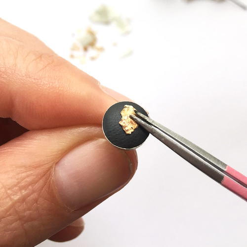 Use a toothpick or a pair of tweezers to pick up gold flakes and place them into the uncured wet Crystal Clay. Once you have the gold mica flakes in the position that you want, use your fingertips to press the flakes down into the clay.