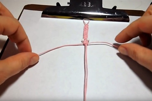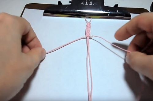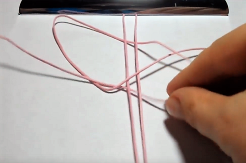 Take the right side and place over the left cord, then under the center cord(s) and up through the loop that was formed in step 3.