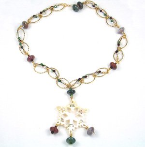 - Use cutters to cut the heads off of five head pins. Use 1 head pin wire to form a wrapped loop that attaches to the top of the snowflake pendant. String 1 emerald bicone, 1 fancy jasper rondelle, and 1 emerald bicone. Form a wrapped loop. Attach one 6mm jump ring to the wrapped loop. Set aside.
