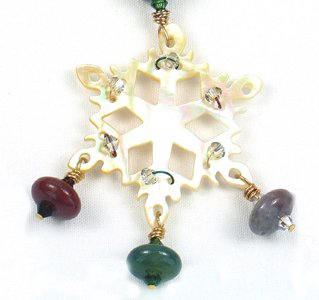 - Use 1 head pin to string 1 emerald bicone, 1 fancy jasper rondelle, and 1 emerald bicone. Form a wrapped loop that attaches to the bottom of the snowflake pendant. Use 1 head pin to string 1 Siam bicone, 1 fancy jasper rondelle, and 1 Siam bicone. Form a wrapped loop that attaches to the bottom left of the snowflake pendant. Use 1 head pin to string 1 crystal bicone, 1 fancy jasper rondelle, and 1 crystal bicone. Form a wrapped loop that attachest o the bottom right of the snowflake pendant.