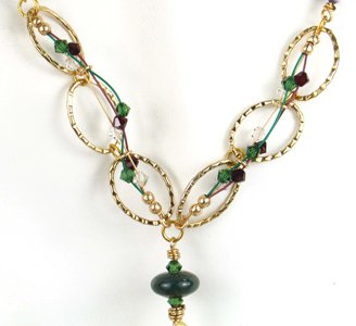 - Repeat Step 5 for the other half of the necklace. Attach one 6mm jump ring to the final oval ring. Use 6" of 24K Gold wire to string the 6mm jump ring to the center of the wire. Use both ends of the wire to string 1 crimp tube. Snug the tube by the jump ring. Use both ends of wire to pass back through the tube, forming a loop of wire large enough to pass over the first fancy jasper rondelle in the dangle formed in Step 6, but not so large that it will slip off the rondelle. Adjust the wire as necessary and crimp. Cover the tube with a crimp cover.