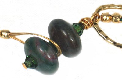 - Use 1 head pin to string 1 emerald bicone, 1 fancy jasper rondelle, 1 emerald bicone, 1 fancy jasper rondelle, and 1 emerald bicone. Form a wrapped loop that attaches to the final oval ring used in Step 5.