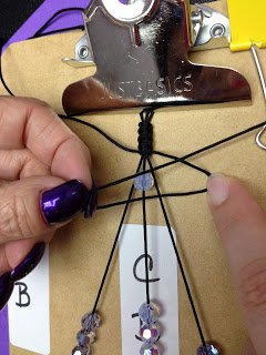 - Keeping your knotting cords out to their respective sides, carefully unclip your three beading cords. Pull them together and clip them down with one binder clip.