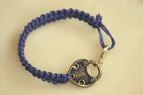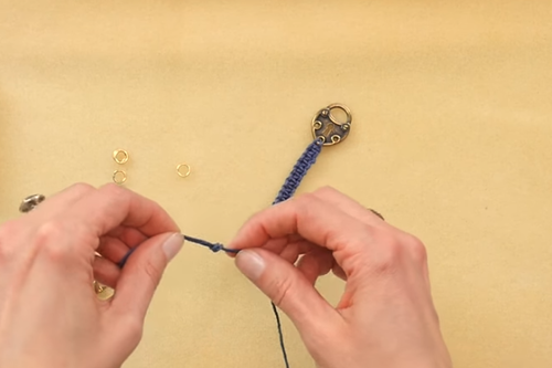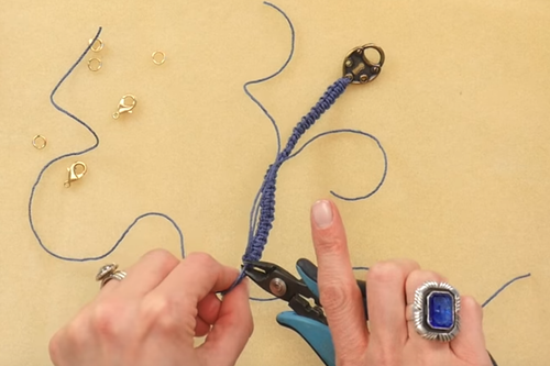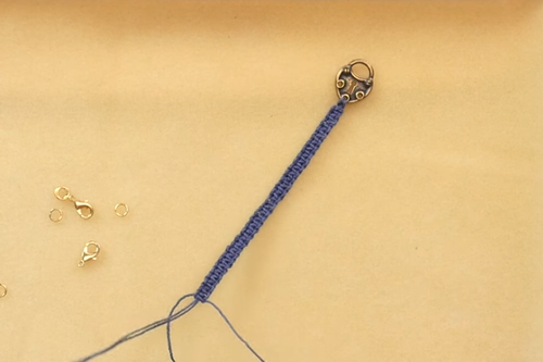 Once you are ready to finish your macrame bracelet, you will create a loop at the end, where you can attach a lobster clasp to connect to either your decorative link, or the beginning loop.