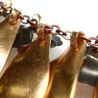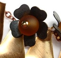 Feed one topaz round and one gun metal flower onto a head pin. There are three short links in between the long chain links; feed the head pin from front to back through the center short link to the right of the center leaf. Trim the head pin to 1/4 inch and turn a loop. Repeat on the left side of the center leaf and on either side of the third leaves from the center.