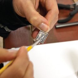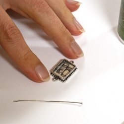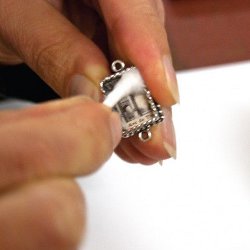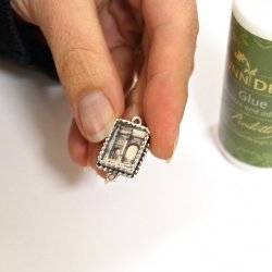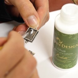 Using the Nunn Design Glue, paint a thin coat into the base of the bezel. Place your collage image from Step 1 into the base of the bezel on the wet glue. Starting in the center, burnish the image down with a cotton swab, pressing any excess glue out to the edges.
