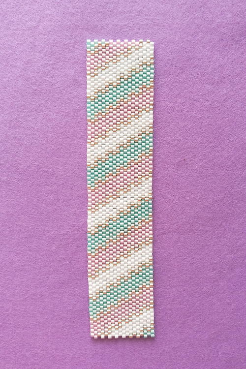 Once you have a few rows made up, you’ll start to see the diagonal pastel colored waves forming. Keep on beading each and every row according to the pattern.