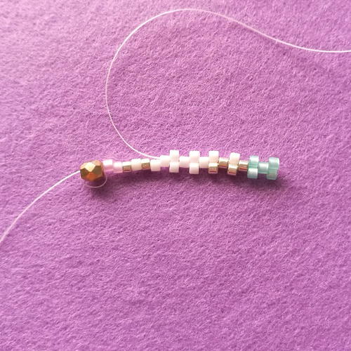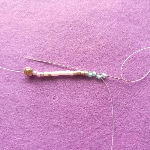 To make the next row, you’ll be working from right to left this time. In the pattern, this is row 3, with 9 Delicas to pick up. Pick up the first bead for this row and then skip the last bead that you threaded on. Pass your needle through the next bead along in the previous row, as shown above.