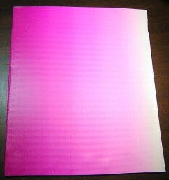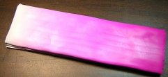 Fold the White/Fuchsia clay sheet in half so that the white corner touches the opposite white corner and the fuchsia corner touches the opposite fuchsia corner. Leading with the folded edge, press the folded sheet back through the Clay Conditioning Machine on the #1 setting. Keep folding the sheet and pressing it back through the machine at least 25 times or until the colors are blended all the way across. It is important during this step to always fold White corner to White corner and Fuchsia corner to Fuchsia corner. Once your sheet is completely blended, trim the edges and set the extra clay aside. This is called a Skinner Blend. -