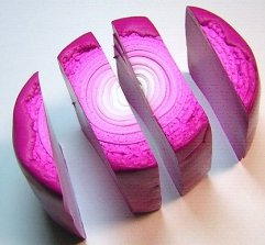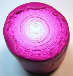 Take the leftover White, Fuchsia and Pomegranate clays and make small sheets. Run each color through the Clay Conditioning Machine on the #3 setting. Stack the colors and roll them into a small jelly roll cane.