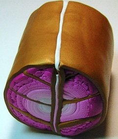 Starting on the white end of the sheet, roll the sheet completely up jelly roll style with the White in the middle and the Fuchsia on the outside. This will be your first leaf cane.
