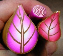 Reduce your leaf canes and jelly roll cane to the size you want to use and form into a leaf shape. The White line at the top will ensure that your leaves are not distorted. You can reduce the cane to various sizes so you have some variation in your leaves.