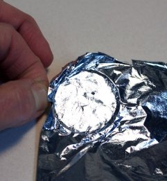 Carefully open the silver leaf package and lift a leaf out. Place the leaf onto the black clay and press lightly; it should adhere to the clay when you press. Tear away the leaf, leaving it only on the clay circle. If some of it comes off, take a small piece of leaf and replace it.