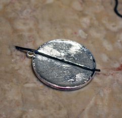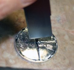 Using the Super Slicer blade, make an indentation in the circle, just off center. Make the indentation deep but not all the way to the bottom of the bezel. Make another indentation in the half circle.