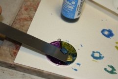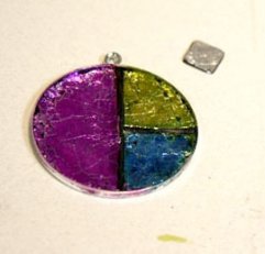 Alcohol inks dry out in the paint palette pretty quickly, so you’ll have to replenish your ink supply as you go. It’s important to have a fine brush so that you don’t leave streaks in the ink and the leaf. (Note: alcohol inks will stain the pendant finding. Be careful to keep the pendant finding clean.) Using the Wild Plum ink, paint the large section of your pendant. After you have covered the entire section, let it dry for about two minutes. Clean your brush with the alcohol and towel. Wet the towel with alcohol and clean the brush with the damp cloth. Using the Citrus ink, paint the upper right section of the pendant; let it dry for about two minutes. Clean your brush with the alcohol and towel. Using the Cool Stream ink, paint the lower right section of the pendant; let it dry for about two minutes. Clean your brush with the alcohol and towel.