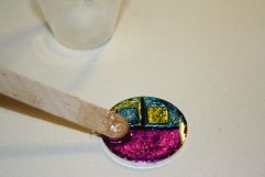 Place the pendant on a piece of wax paper in case of spills. Make sure you’re working in a well ventilated area. Use about ¼ of an inch of the resin in the applicator tube. To mix the resin, use a wooden stir stick and a disposable plastic cup. Following the directions on the resin package, mix and stir the resin; let it rest for five minutes before pouring onto the pendant. Slowly pour the resin onto the pendant and spread with the wooden stir stick. Let dry completely.