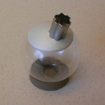 3. Press the mini flower shape cutter, a little off center, into the round clay shape. Remove the flower cutter but leave the clay flower shape as is. Put the ceramic tile with the bulb on a baking tray and bake at 275 degrees for 25 minutes. Allow the clay to cool and remove the round shape from the glass bulb and push out the baked flower.