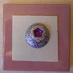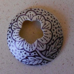 9. When cool remove clay pieces from the ceramic tile and add a drop of clear, quick drying glue to the flat areas of the circle and glue to the top back area of the round flower pendant. Brush a coat of Sculpey Glossy Glaze to the front of the pendant. This will not only protect your drawing but add a glittery look to the Pearl clay. When the pendant is dry string your necklace cord through the clay bail.
