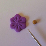 5. Roll some Purple Pearl clay through the Clay Conditioning Machine on a medium thickness and place on a piece of paper. Cut out a flower shape with the mini cutter, remove excess clay, and then using the needle point impress flower details into the clay. Roll a pinch of Gold clay into a small ball which will be used as the flower stigma.