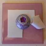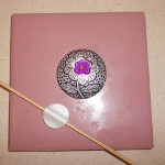 6. Roll a sheet of Pearl clay through the Clay Conditioning Machine on a medium thickness and using the Super Slicer cut a 3” square of clay. Place the sheet of clay on a ceramic tile. Using the ball tipped tool pick up the flower shape and curve is around the ball so it is not flat and looks more like a flower. Press the flower shape onto the 3” square and put the gold ball in the center of the flower. Next place the baked flower design on top of the clay sheet so the mini Purple flower is showing through the opening.