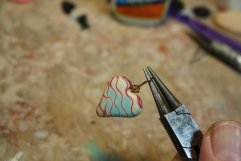 Bake as directed above. After the heart has cooled, add the bead using a headpin and a bead of your choice. For the headpin, you will need to put a small amount of fast setting clear glue on the tip of the headpin and insert it into the heart; let it dry for about 15 minutes. To make the loop, use the round nose pliers; make a right angle bend in the wire at the tip of the bead. Then grab the tip of the wire with the pliers and make a half circle; reposition the pliers and continue making the full circle.