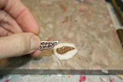 Using Mold Maker and the metal wing charm, make a wing mold. Using your Ecru mix, make a wing. Trim off excess clay using a craft knife and bake it as directed above. After the wing has cooled, paint the wing with the brown acrylic paint. While the paint is wet, wipe off for an antique bone effect.