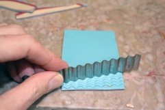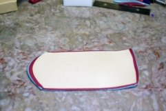 To make the Ecru sheet of clay, mix the following colors together: 1 part Ecru, 1 part Pearl and 1 part Translucent. To make the Crimson sheet of clay, mix 1 part of the Ecru mixture with 1/4 part Alizarin Crimson. To make the Turquoise sheet of clay, mix 1 part of the Ecru mixture with one part turquoise and a pinch of White.