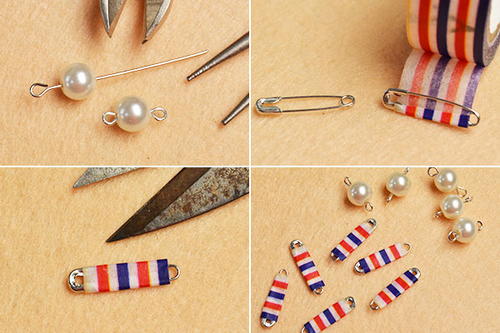 Make 6 safety pins with washi tape and 6 eyepins with white pearl beads.