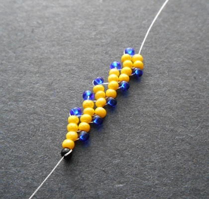 One of the loveliest chain stitches for beadweaving is the angled St. Petersburg stitch. This simple technique uses a repetition of three steps to create a procession of slanted seed bead columns that are easy to embellish and combine for different looks. To stitch a basic St. Petersburg chain, you will need size 11/o seed beads in at least one color and size D beading thread. Two bead colors are used here to show the different steps used to create this pretty chain.