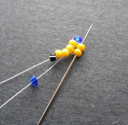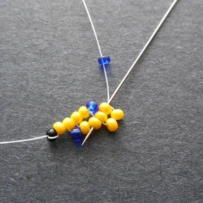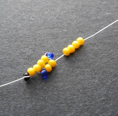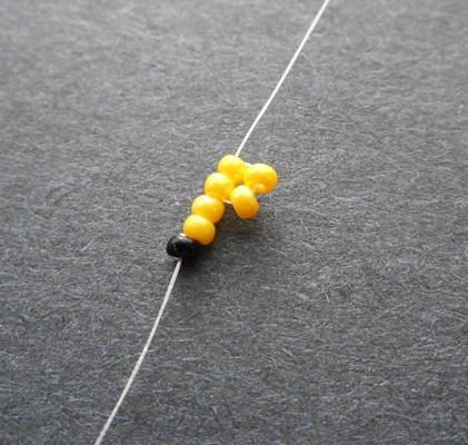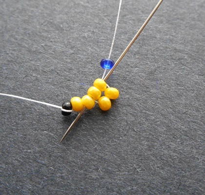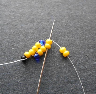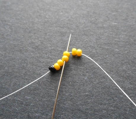 Attach a stop bead to the thread, leaving an 8 inch tail. Pick up 6 seed beads, and slide them down to the stop bead.