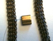 Each of the Tila beads has two holes. With your threaded needle, string through the top hole and across into the second strand of SilverSilk, connecting the two pieces of knitted wire. Go back through your Tila bead a second time and catch the side of the knit again, sewing back into the knit wire. Then bringing the Fireline down the outer edge of the knit, along the edge of the knit, dive back into the stitch beside the second hole of the Tila, sewing into the knit and then going back into the second hole