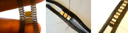 Sew the Tila beads into the SilverSilk knit. First, stitch each of the Tila beads between the two SilverSilk strands. Later in this