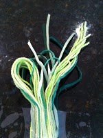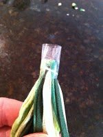 - Take a random bunch of all the ribbons, suede, yarn and folded in three parts (will be the length of your necklace).