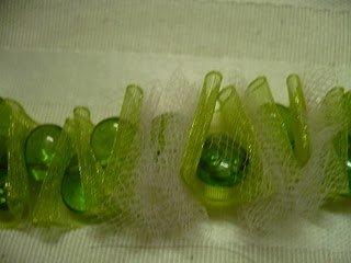 - Cut some small tulle strips ( about 3 inches long and about the same width as the ribbon). Now thread the bead, make a running stitch on the ribbon and fold your tulle strip in an accordian fold and thread the needle through it. Make another running stitch on the ribbon. If you have matching tulle this will soften the look and give the necklace a more romantic touch.