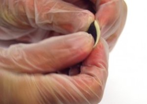 Pinch off two equal (large pea) size balls, of Part A (the color) and Part B (the hardener). Knead the two equal size balls fully together until the clay is a consistent color and not marbled.