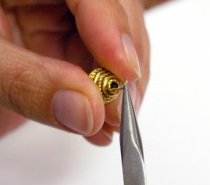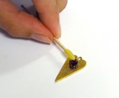 Apply a small amount of clay inside of the bead cap and embed inside bead cap. Using the beeswax toothpick, pick up the individual chatons and gently press each into the epoxy clay in the center of the inside bead cap. Repeat.