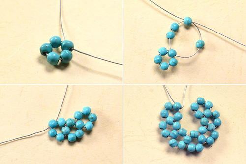 Add 2 turquoise beads onto each side of the wire. Thread the left wire down through the beads on the right wire, then thread the right wire down through the beads on the left wire. Cross the 2 ends of the wire through the center bead to form a loop. Tighten the wire and cut off excess wire.