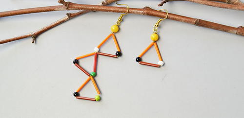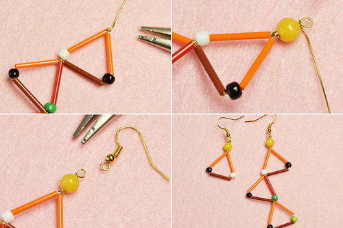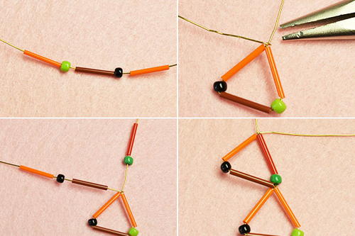Cut off a piece of 0.5mm jewelry wire, then slide a orange bugle beads, a green glass seed bead, a dark red bugle beads, a black seed bead, then another orange bugle beads onto the wire to a triangle shape (as shown in the picture);
