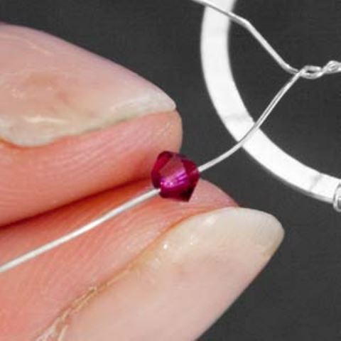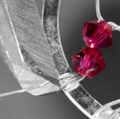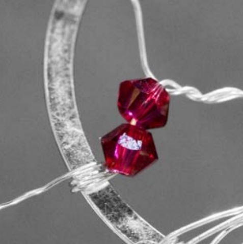 String two 3mm Ruby crystal bicone beads onto one wire, and anchor the wire onto the component.