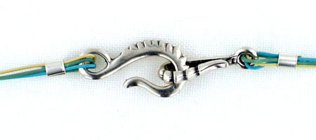 - Use one end of each wire to string one 3mm x 3mm crimp tube and one half of the clasp. Pass back through the tube, leaving as little excess wire as possible, and crimp using Mighty Crimpers. Repeat entire step for the other end of the necklace.
