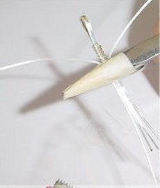 Cut your piece of square wire into 2 pieces 10cm each and 2 pieces 6cm each. Take the two shorter pieces and bind them securely together using tape (do this toward one end). Then, bend the top over something (I used the end of a small fork) to form the bail, as show.