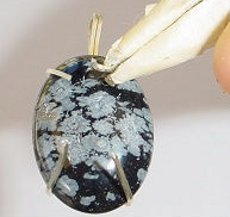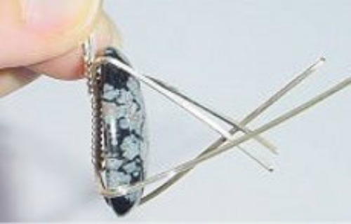 Place it against the flat side of your cabochon. Bend the 4 wires over the stone to hold it in place. The picture below shows all 4 wires bent over to secure the stone.