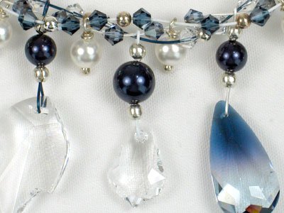 - Cut 23" of Dark Blue Lapis wire. Place a Bead Stopper on one end of the wire. Use the other end of the wire to string {1 crystal bicone, 1 silver round, 1 crystal bicone, 1 night blue 8mm dangle, 1 crystal bicone, 1 silver round, 1 crystal bicone, and 1 night blue 6mm dangle} twice. String {1 crystal bicone, 1 silver round, 1 crystal bicone, 1 baroque dangle, 1 crystal bicone, 1 silver round, 1 crystal bicone, and 1 leaf dangle} four times. String 1 crystal bicone, 1 silver round, 1 crystal bicone, 1 baroque dangle, 1 crystal bicone, 1 silver round, 1 crystal bicone, the flat teardrop dangle, 1 crystal bicone, 1 silver round, 1 crystal bicone, and 1 baroque dangle. String {1 crystal bicone, 1 silver round, 1 crystal bicone, 1 leaf dangle, 1 crystal bicone, 1 silver round, 1 crystal bicone, and 1 baroque dangle} twice. String {1 crystal bicone, 1 silver round, 1 crystal bicone, 1 night blue 6mm dangle, 1 crystal bicone, 1 silver round, 1 crystal bicone, and 1 night blue 8mm dangle} twice. String 1 crystal bicone, 1 silver round, and 1 crystal bicone. Place a Bead Stopper on the end of the wire.