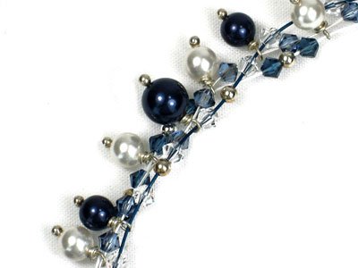 - Use the 925 Sterling Silver wire to pass through the first dangle on the Dark Blue Lapis wire and string 1 light sapphire satin bicone. Pass the 925 Sterling Silver wire through the first dangle on the White Quartz wire and string 1 light sapphire satin bicone. *Pass through the next dangle on the Dark Blue Lapis wire and string 1 light sapphire satin bicone. Pass through the next dangle on the White Quartz wire and string 1 light sapphire satin bicone. Repeat from * for the length of the necklace. Finish by passing through the final dangle on the Dark Blue Lapis wire.