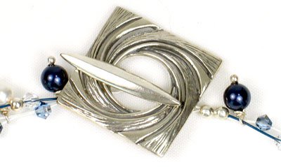 - Use 4" of 925 Sterling Silver wire to string 1 crimp tube and the flat teardrop pendant. Pass back through the tube, leaving a loop of wire large enough for the pendant to move freely, and crimp. Cover the tube with a crimp cover. Use the other end of the wire to string 1 night blue 6mm pearl and 1 crimp tube. Pass back through the tube, leaving about a 3mm loop of wire, and crimp. Cover the tube with a crimp cover. Set aside.